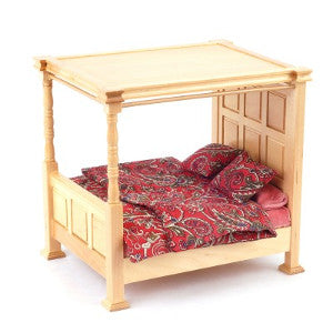 1/12th scale light oak four poster bed with a wood panelled back and ceiling. Mattress and red paisley bedding is included